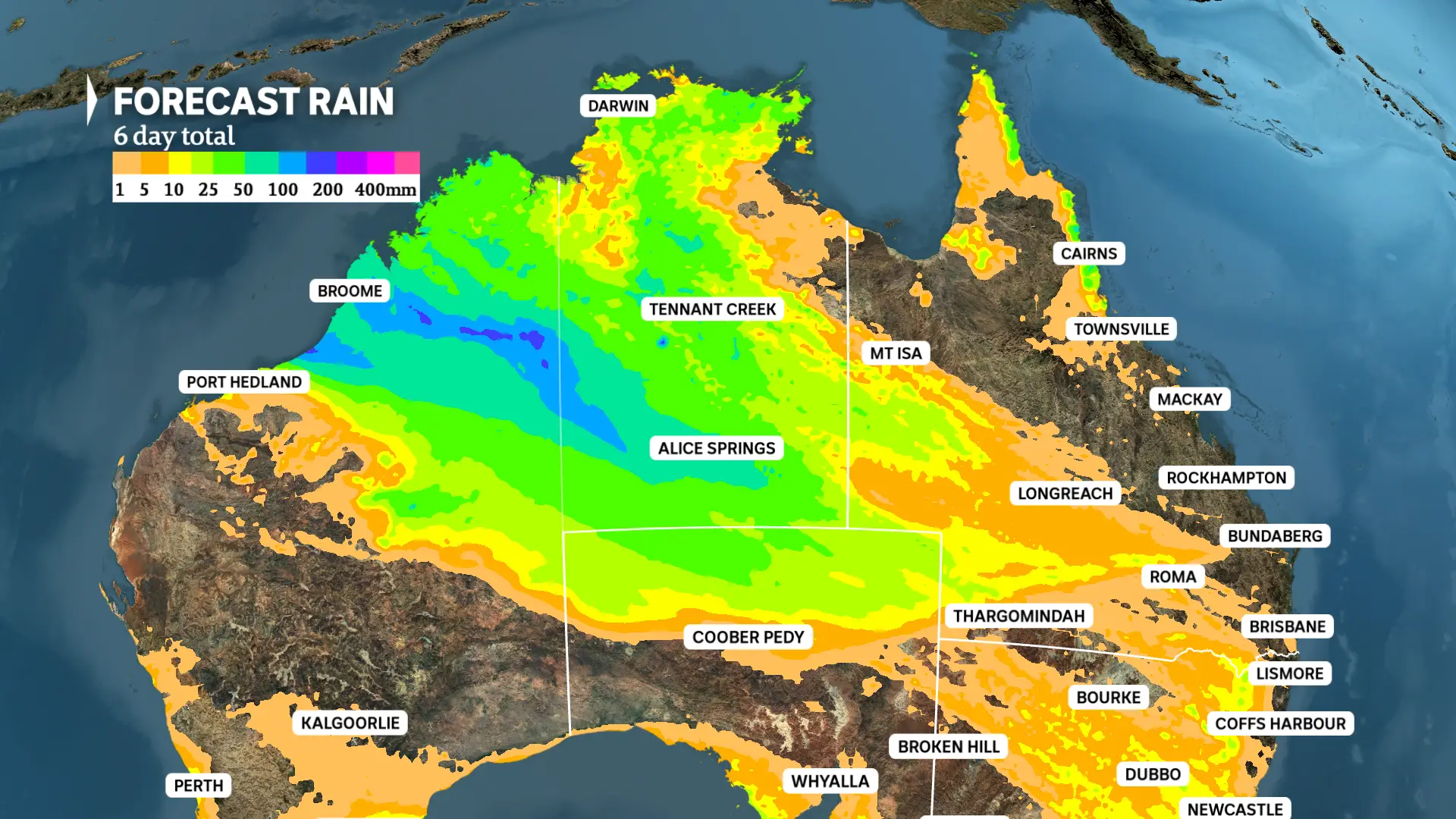 Below is one model’s current weekly rain forecast showing the extent of the rain covering most of central and northern Australia.